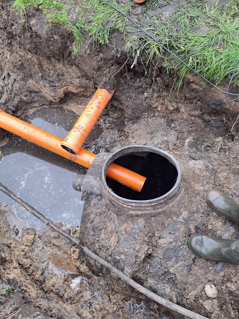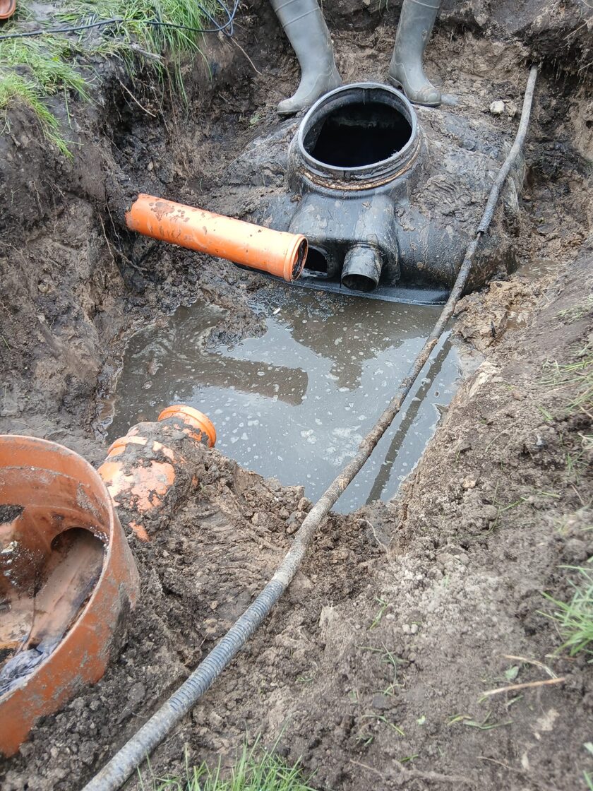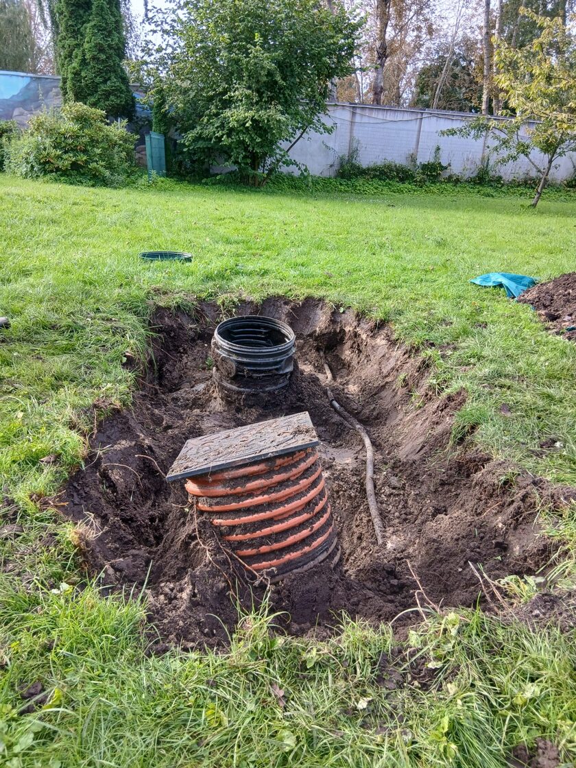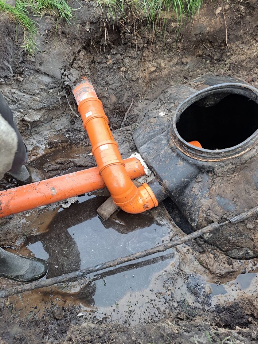 Из-за сильных дождей колодец был размытый и деформировался. Клиент не хотел полностью вскрывать и перестраивать весь колодец, а попросил выполнить ремонтные работы на подводящих трубопроводах. Выяснилось, что все канализационные трубы, которые должны были отводить воду в биологическую очистную систему, поднялись вверх. В результате вода не поступала в резервуар, а скапливалась в самих трубах.
